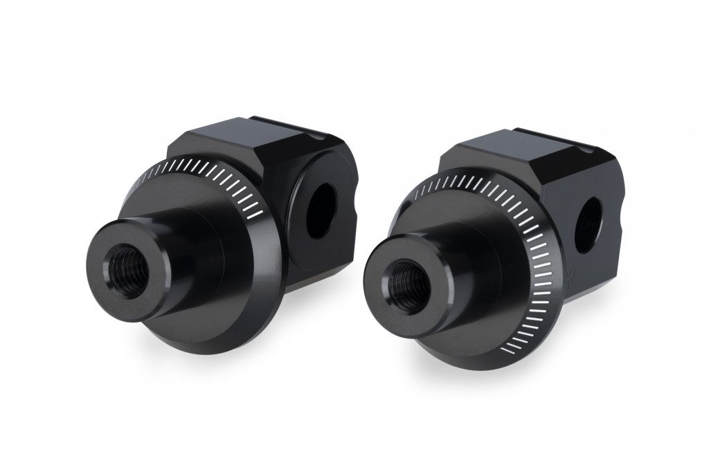Manufactured from a machined solid aluminum block, these components stand out for their high precision and strength. They feature a black anodized finish that ensures durability and an elegant appearance. They are model-specific, guaranteeing a perfect fit, and include millimetric markings that allow the footpeg to be adjusted with absolute precision according to each rider’s preferences.