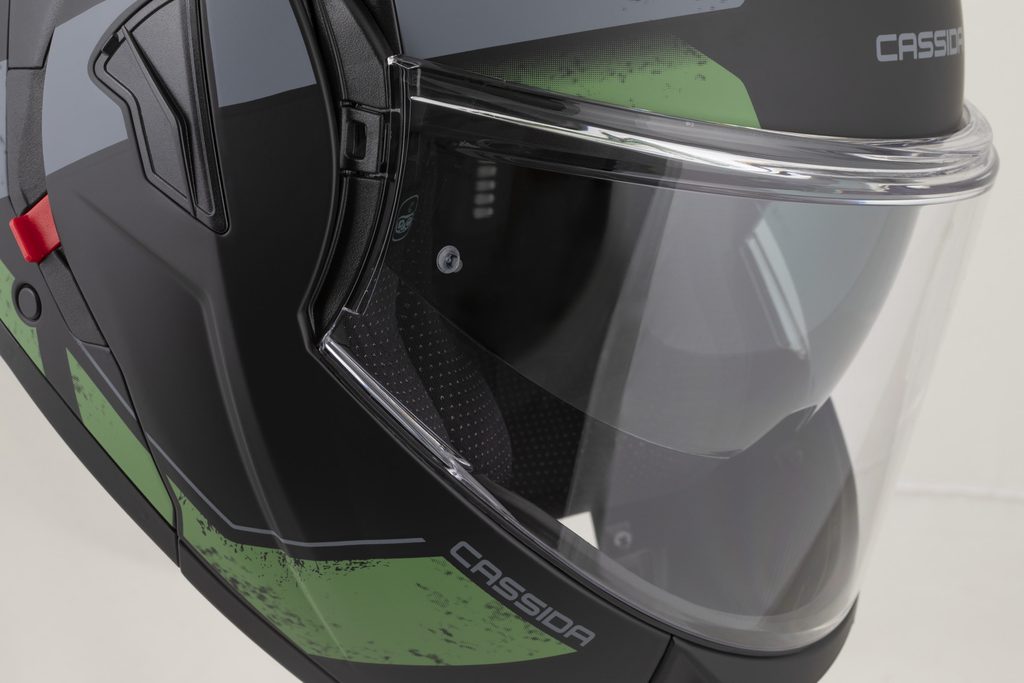 • Dual homologation ECE 22.06 P/J for both open-face and full-face use, with the option to lock the flip-up section in the open position using a safety latch.