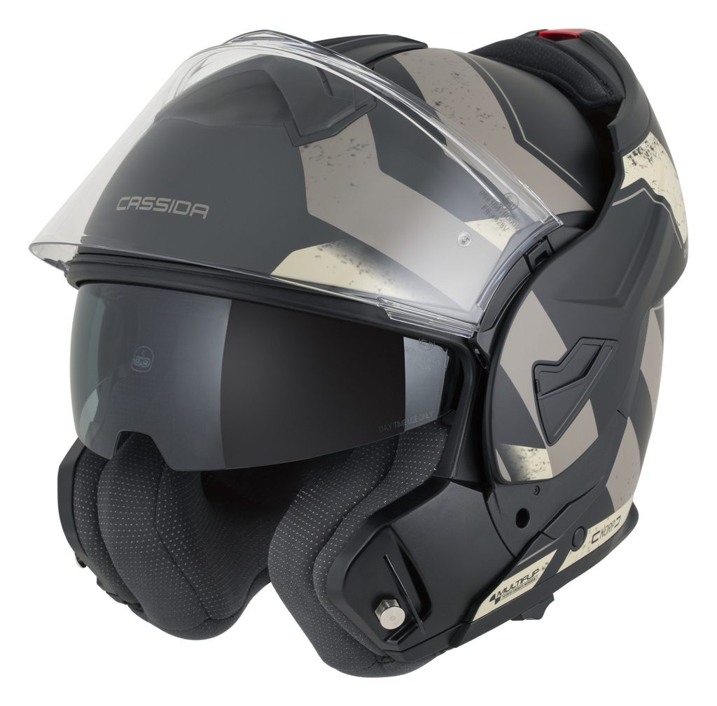 • Dual homologation ECE 22.06 P/J for both open-face and full-face use, with the option to lock the flip-up section in the open position using a safety latch.