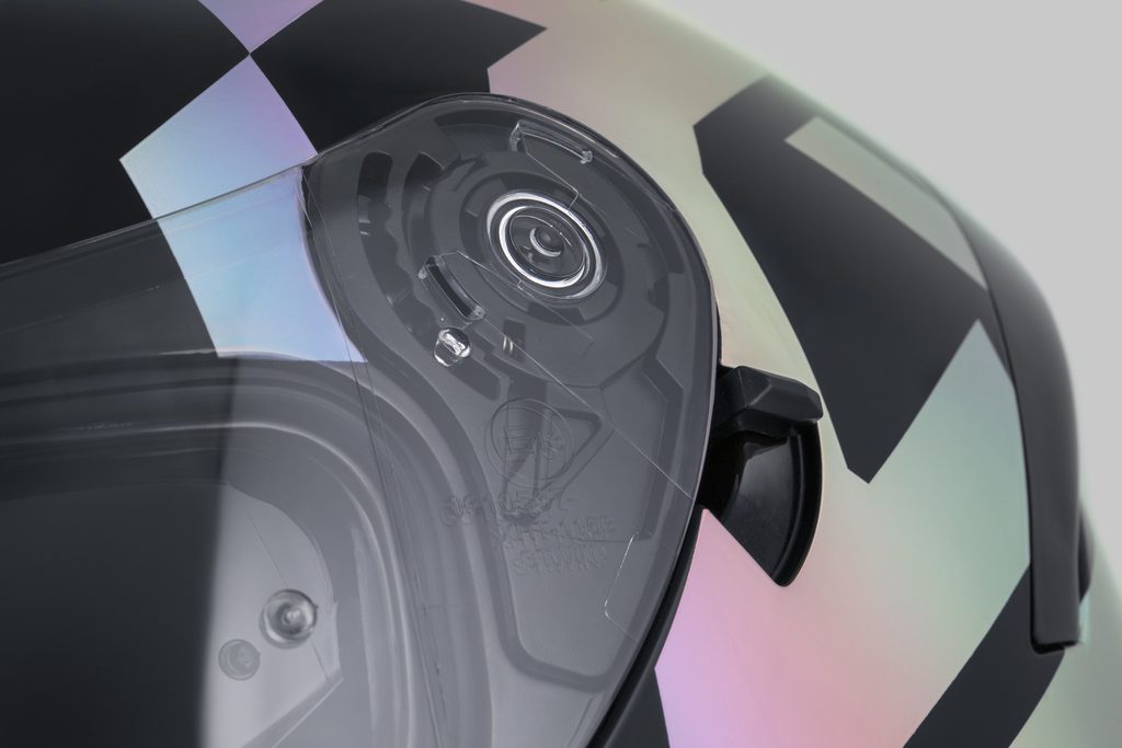 • Quick-release visor mechanism with multiple position settings and a locking tab to secure the visor in the closed position