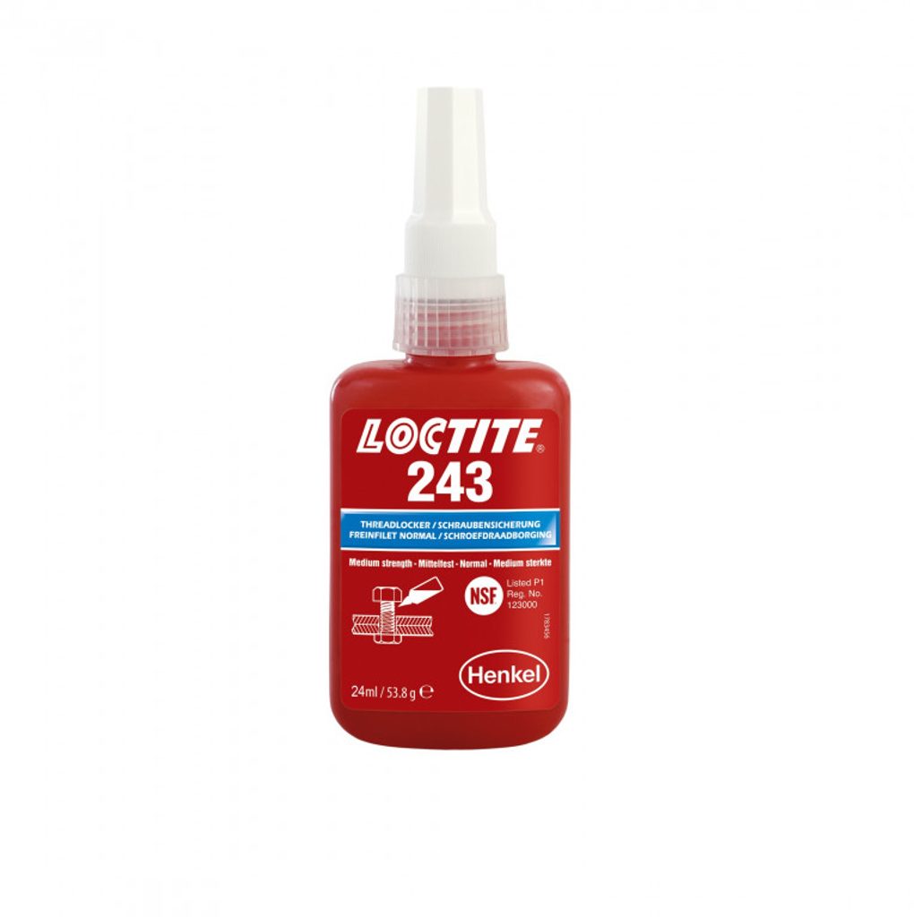 LOCTITE 243 je univerzální zajišťovač závitů se střední pevností spoje. Tento zajišťovač závitů zajišťuje a utěsňuje šrouby, matice a svorníky a předchází tak uvolňování vlivem vibrací. Tento produkt funguje na všech kovech, včetně pasivních podkladů jako je nerezová ocel nebo hliníkové a pokovené povrchy. Snáší mírné znečištění průmyslovými oleji, např. motorovými oleji, antikorozními oleji a řeznými kapalinami.
