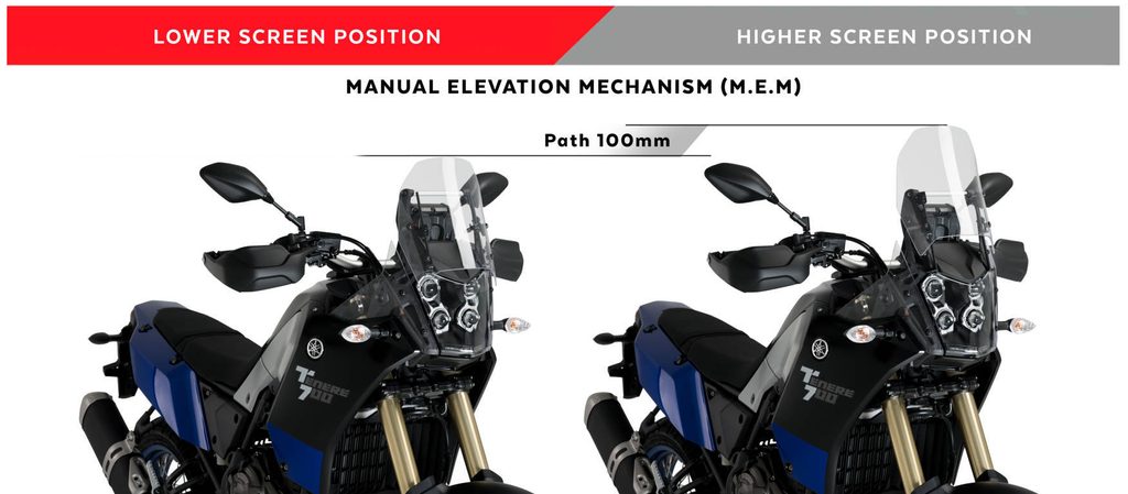 Improves the performance of your Yamaha Tenere 700 and provides it an aerodynamic adaptable protection to every moment and situation of your driving thanks to the M.E.M. (Manual Lifting Mechanism) for your screen. You can activate the mechanism and place the screen in the position you want with a quick and easy "click" on the side tabs, and reattach it with just your hands, without the need of tools. The rider can move the screen up to 100mm. The assembly is extremely simple, with only 4 screws, it is delivered with detailed step-by-step instructions, in paper and PDF on the web, to be able to install the product quickly without the need of mechanical knowledge.
