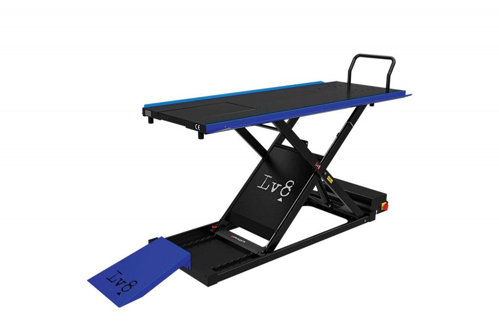 The platform of the LV8 NANO motorcycle lift is provided with removable gate to facilitate the demounting of motorbikes rear wheels and it is equipped with set-up for fitting wheel clamps, front extensions, ratchet tie downs and antiskid central covers.