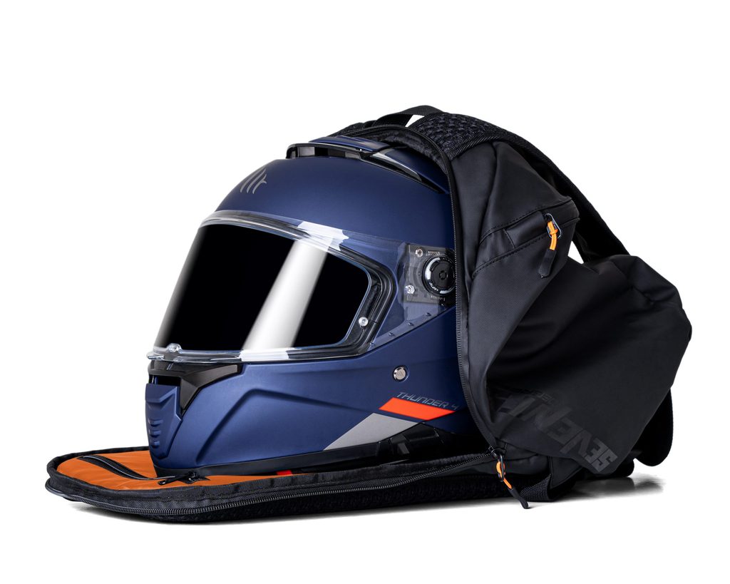 Practical anti-theft 28 liter backpack, with a minimalist and elegant design, made to carry a helmet and much more. Main compartment with a rear access zipper, with space for a fullface helmet, opening in the back with extra wide access. It also has a divider flap for documents, laptop or tablet and a zippered pocket. Large front pocket for other items. Made of waterproof PU laminated polyester with zippers, water proof. Quick-adjusting shoulder straps. Adjustable chest strap also in height. Orange waterproof cover and reflective details. Padded and ventilated back and shoulder straps for maximum comfort while moving. Zipper pullers for easy opening with gloves.