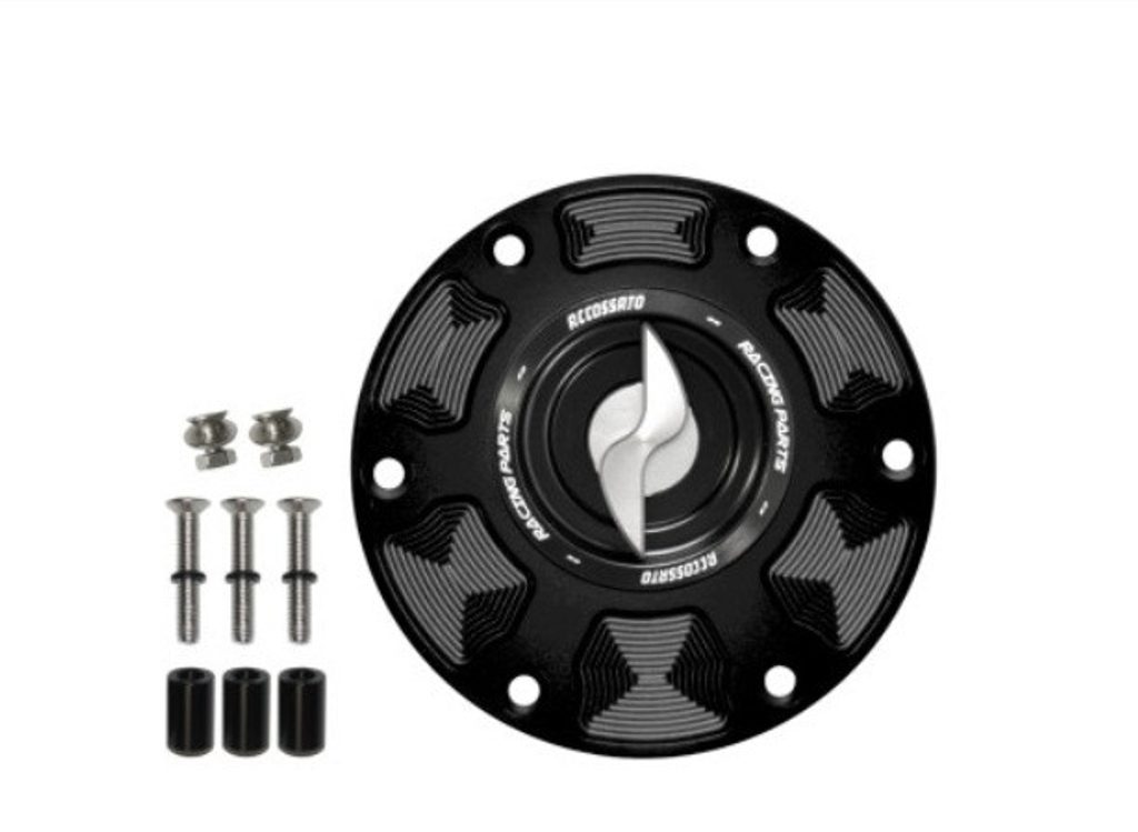 The new Accossato petrol tank cap for Triumph motorbikes has a new , eye-catching design. The quick-release pawl can be in various colours. The Accossato cap is made entirely of cnc-cut aluminium.