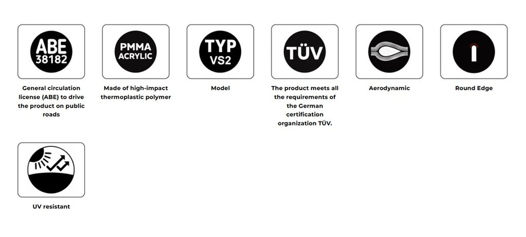 These Touring screens are manufactured using the most advanced technologies, using 4mm thick acrylic material, with UV protection and with a 2mm rounded edge. This finish gives it a more elegant touch and offers greater security, fulfilling with the regulations of the German TÜV.