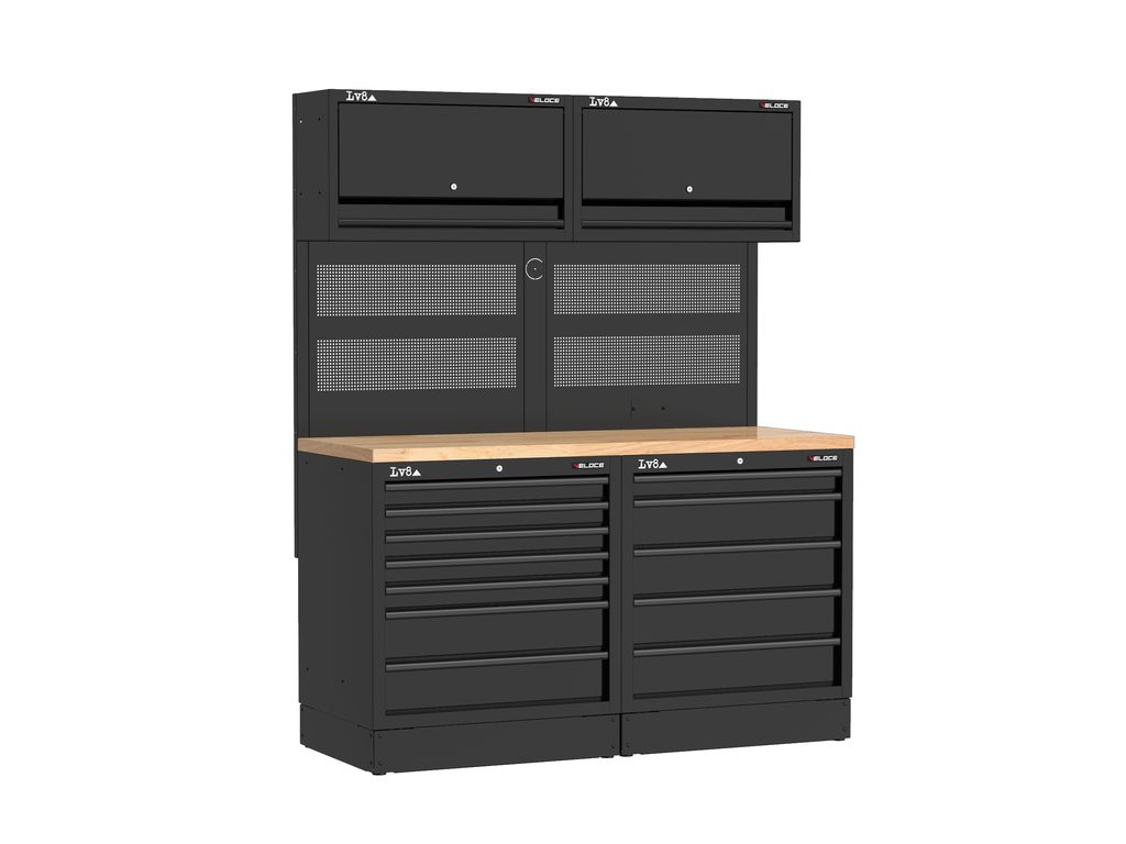 Workbench L. 1600 mm configured with 7-drawer cabinet, 5-cabinet with key lock. Wooden top, double perforated tool holder panel with 2 wall storage cabinets and provision for an electric socket. Also available in stainless steel or melamine top versions.