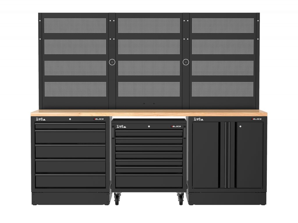Workbench L.2400 mm with 5-drawer cabinet, 7-drawer storage trolley and 2-door cupboard with adjustable inner shelf and key lock. Wooden top, perforated tool holder panels with provision for an electric socket. Also available in stainless steel or melamine top versions.